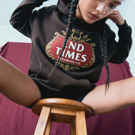 A parody of a certain reassuringly expensive beer, this hoodie toasts to bad choices, long nights, and the slow roast of modern life. The iconic crest is hijacked and rebranded by End Times Tailoring Co. trading elegance for entropy and hops for heat.